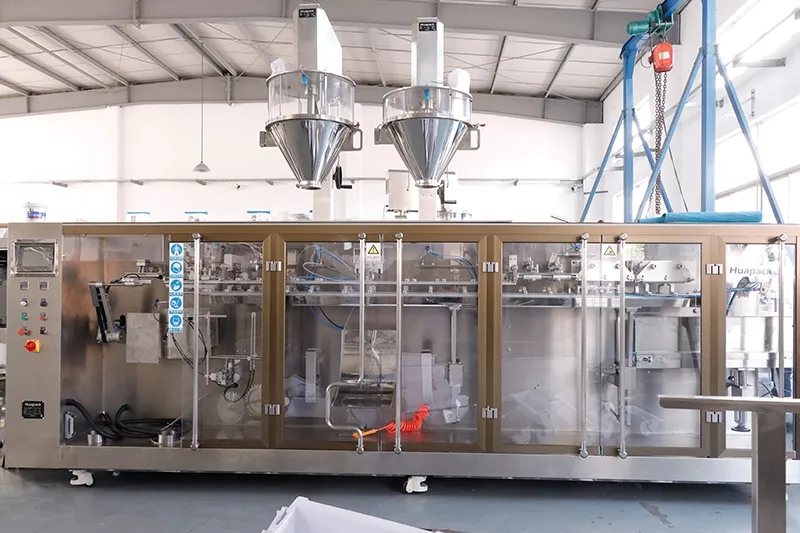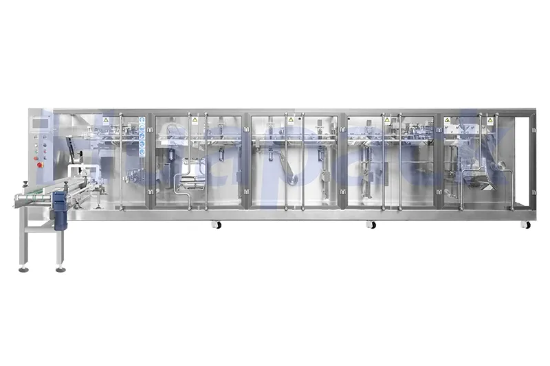Operating at a stable speed of around 40 pouches per minute, these horizontal premade pouch packaging machines are designed for large fill volumes of up to 4000 ml and built with a reinforced structure and high-performance servo drives for continuous, heavy-duty production. The larger hopper and wider filling range reduce the need for frequent refilling, helping the line run more smoothly. These premade pouch filling systems are equipped with a vacuum and nitrogen flushing system to remove air efficiently from high-volume pouches, and the reinforced heat-sealing unit creates firm, reliable seals.